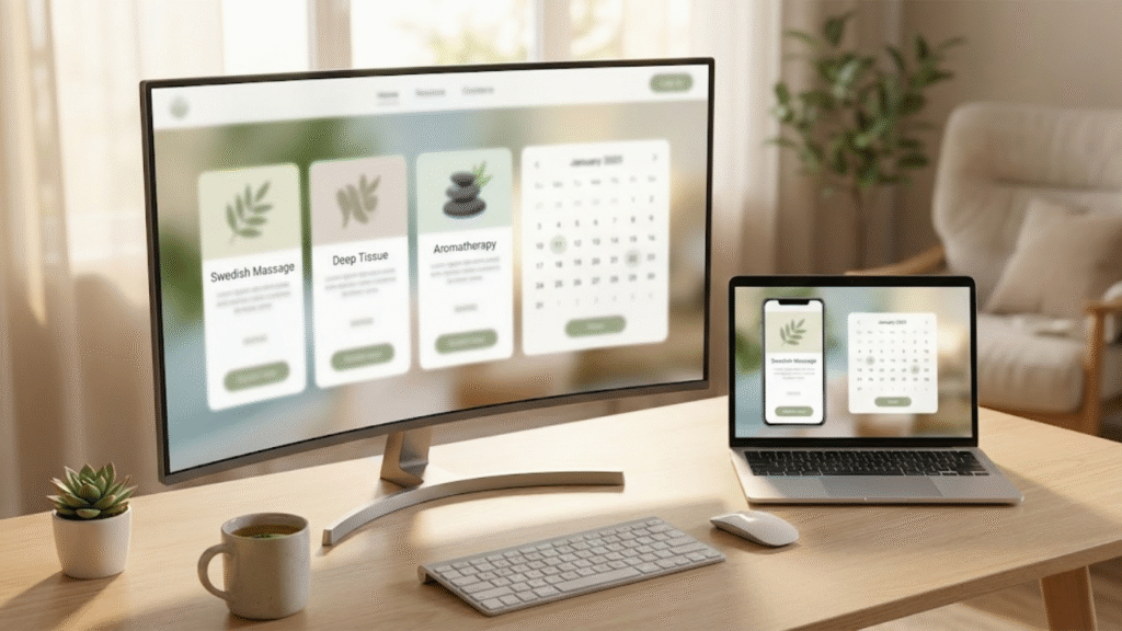 Soft and clean design for massage bookings with easy time selection and clear service options.